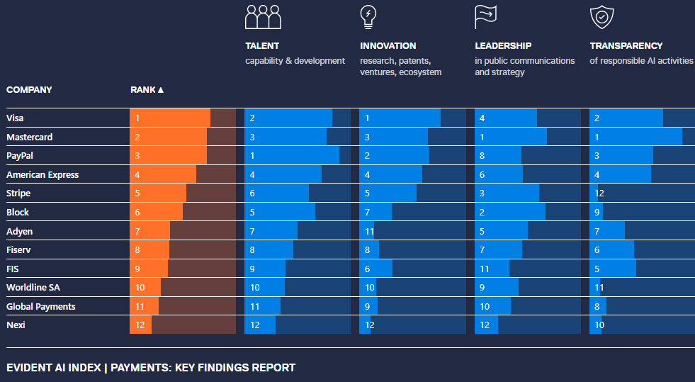 EVIDENT AI INDEX | PAYMENTS: Benchmarking the AI maturity of the largest payment networks and processors in North America and Europe. It evaluates four key pillars: talent, innovation, leadership, and transparency, offering a comprehensive view of who is leading in AI and how the payments sector is evolving.